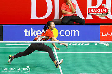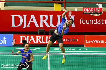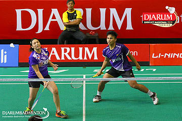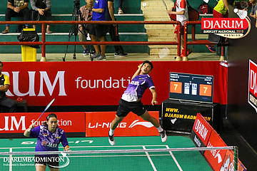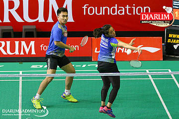 Amri Syahnawi+Pia Zebadiahbernadet (Jaya Raya Jakarta, Jakpus) mengembalikan shuttlecock