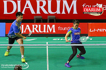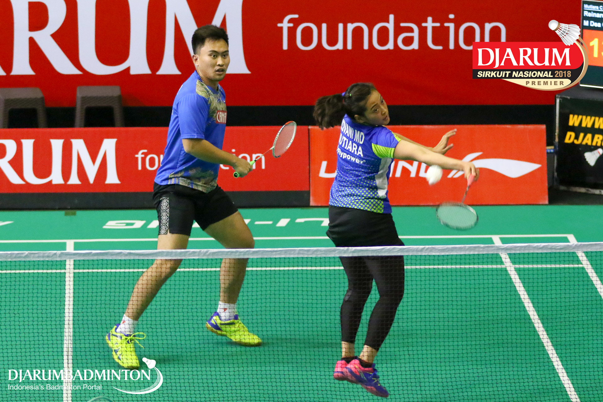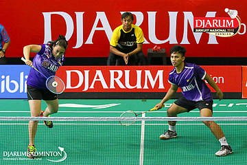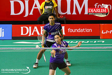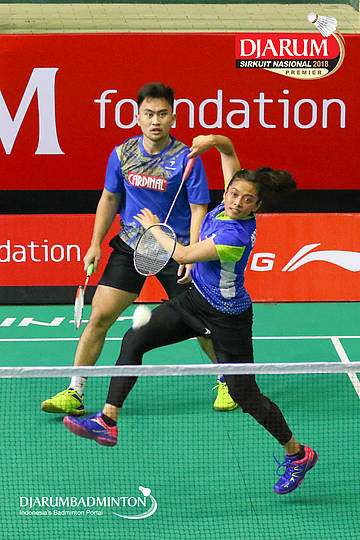 Amri Syahnawi+Pia Zebadiahbernadet (Jaya Raya Jakarta, Jakpus) bersiap menyambut shuttlecock