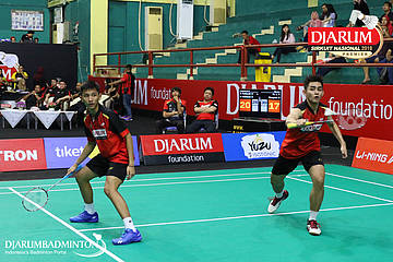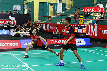 M. Lucky Andres Apriyanda+Respati Banuaji (PB Djarum, Kudus) mengembalikan shuttlecock