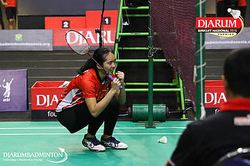 Komang Ayu Cahya Dewi (PB Djarum, Kudus) berusaha mengembalikan shuttlecock