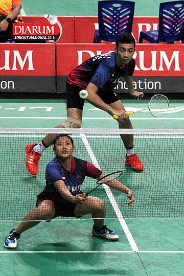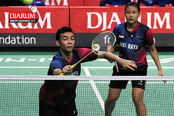 Alfandy Rizki/Phita H. Mentari (Jaya Raya) mengembalikan shuttlecock