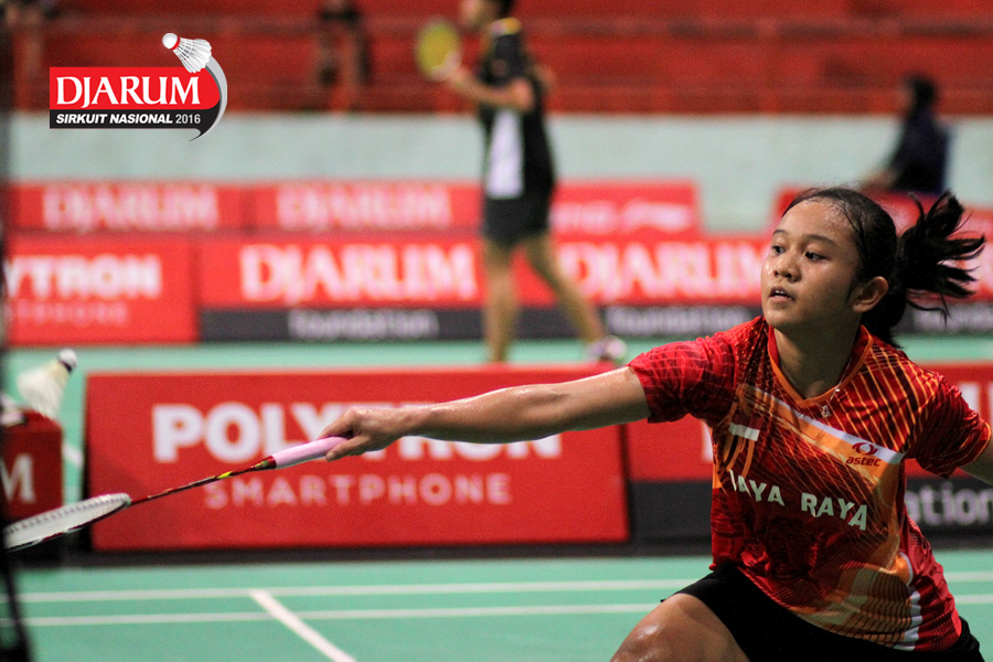 Aurum Oktavia (Jaya Raya) mengembalikan shuttlecock