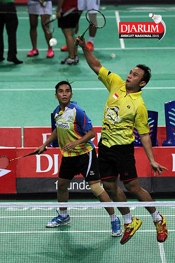 Trikusuma Wardhana/Nadya Melati (Exist/Pertamina Fastron) mengembalikan shuttlecock