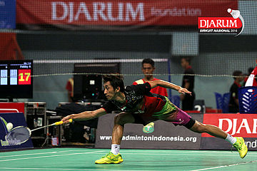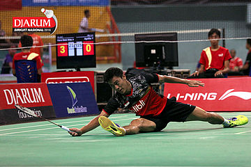 Shesar Hiren (Djarum Kudus) terpeleset saat berusaha mengembalikan shuttlecock