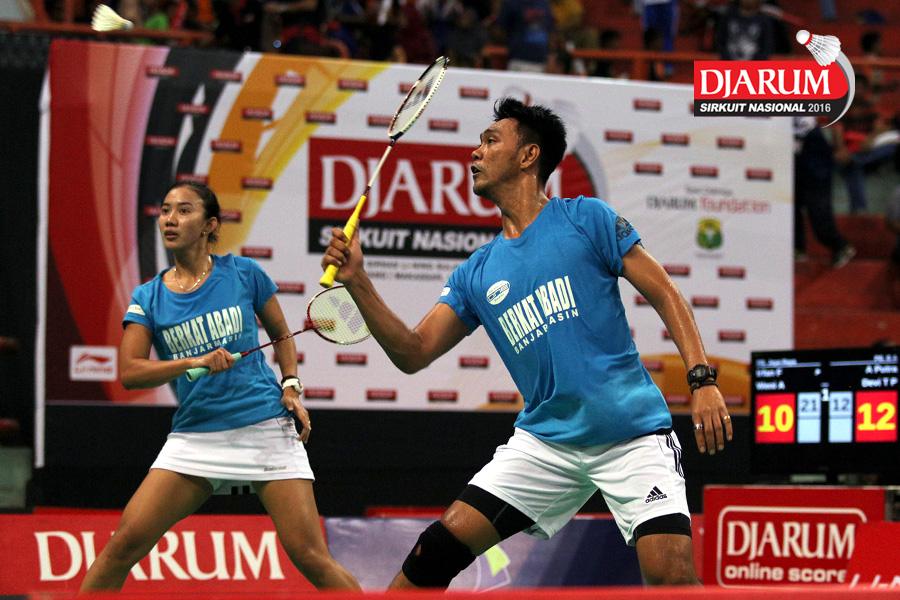 Irfan Fadhillah/Weni Anggraeni (Jaya Raya) mengembalikan shuttlecock