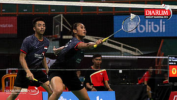 Steven Henri Cornelis/Dinda Haura Salsabila Suhana (Telkom Bandung) mengembalikan shuttlecock