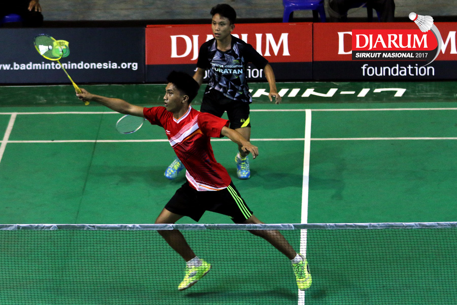 Alfandy Rizki/Emanuel Randhy (Jaya Raya) Mengembalikan Shuttlecock