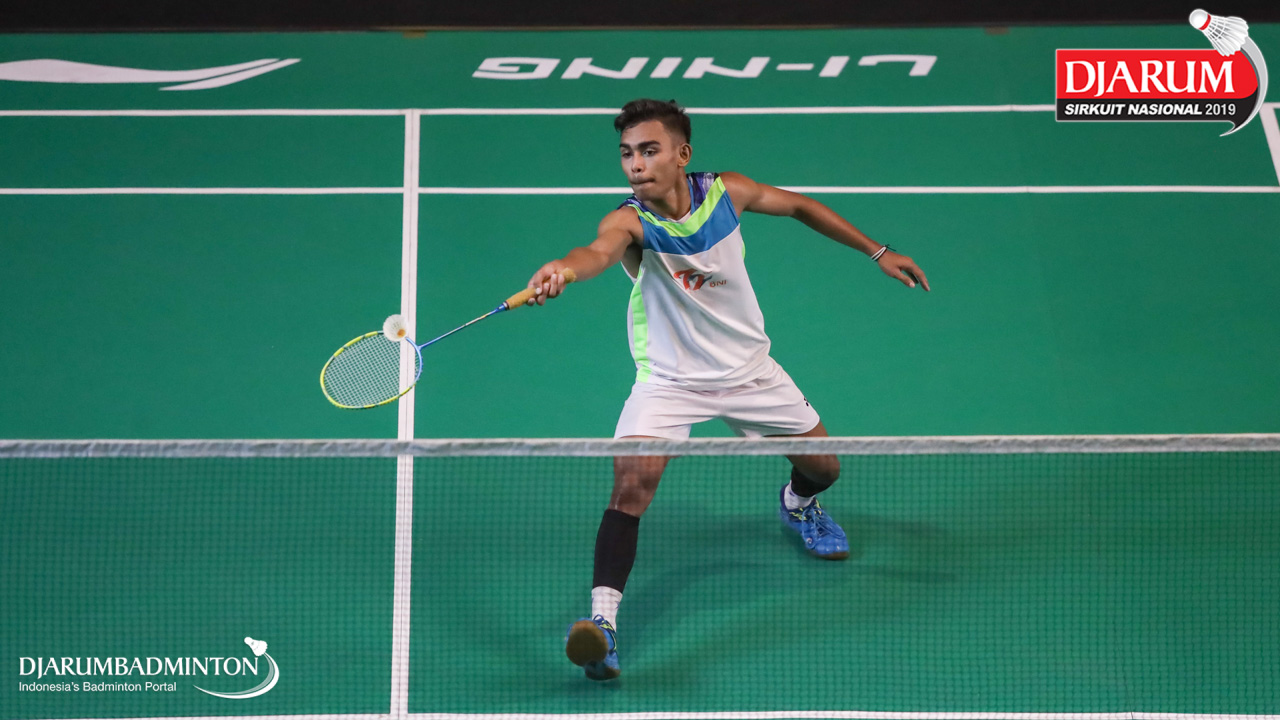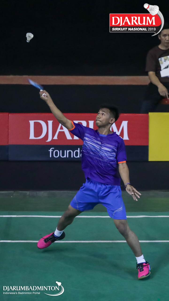 Dinar Taufiqul Hafizh (PB AIC Badminton Academy) bersiap menyambar shuttlecock