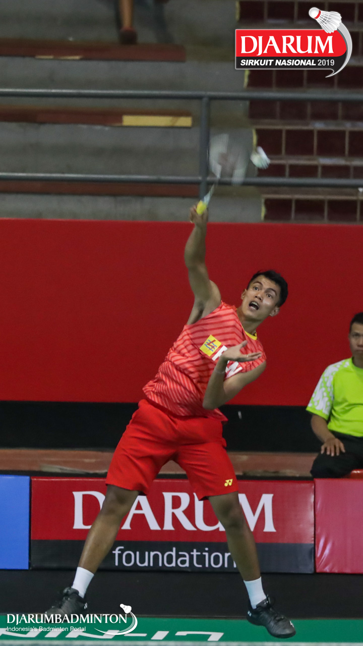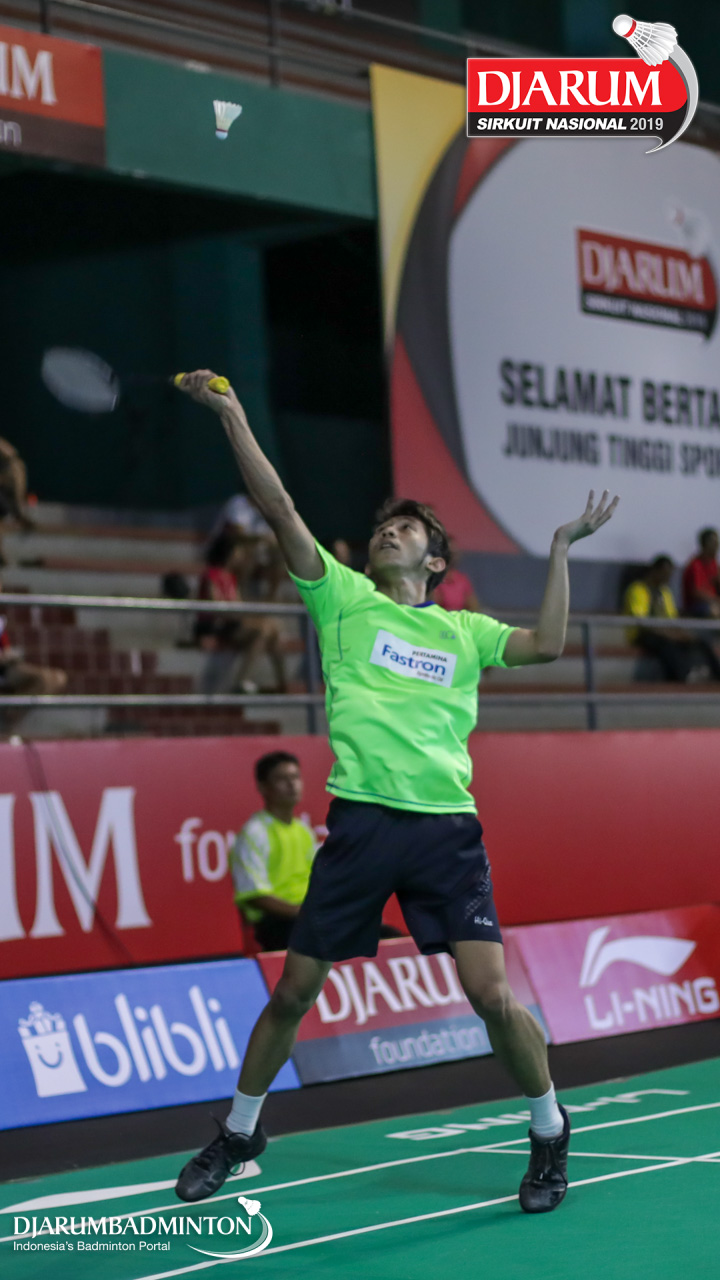 Wisnu Yuli Prasetyo (Pertamina Fastron, Jakut) bersiap mengembalikan shuttlecock