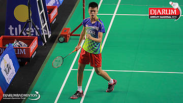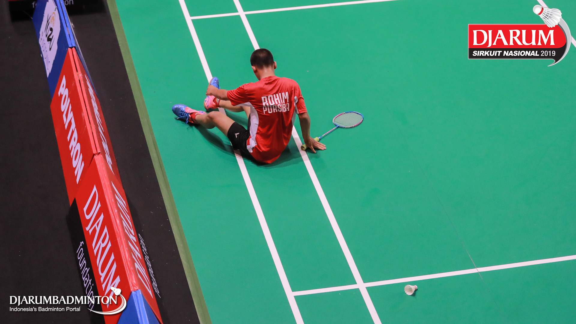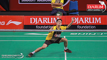 Nor Rohim Muhamad Amin (Porsiba Bukit Asam Tanjung Enim) terjatuh saat berusaha menggapai shuttlecock