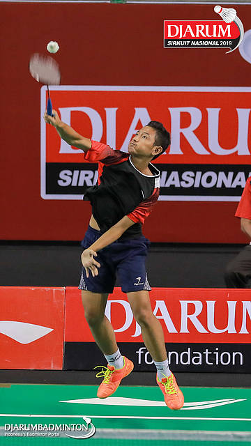 Tegar Sulistio (Exist Badminton Club) melepaskan serangan