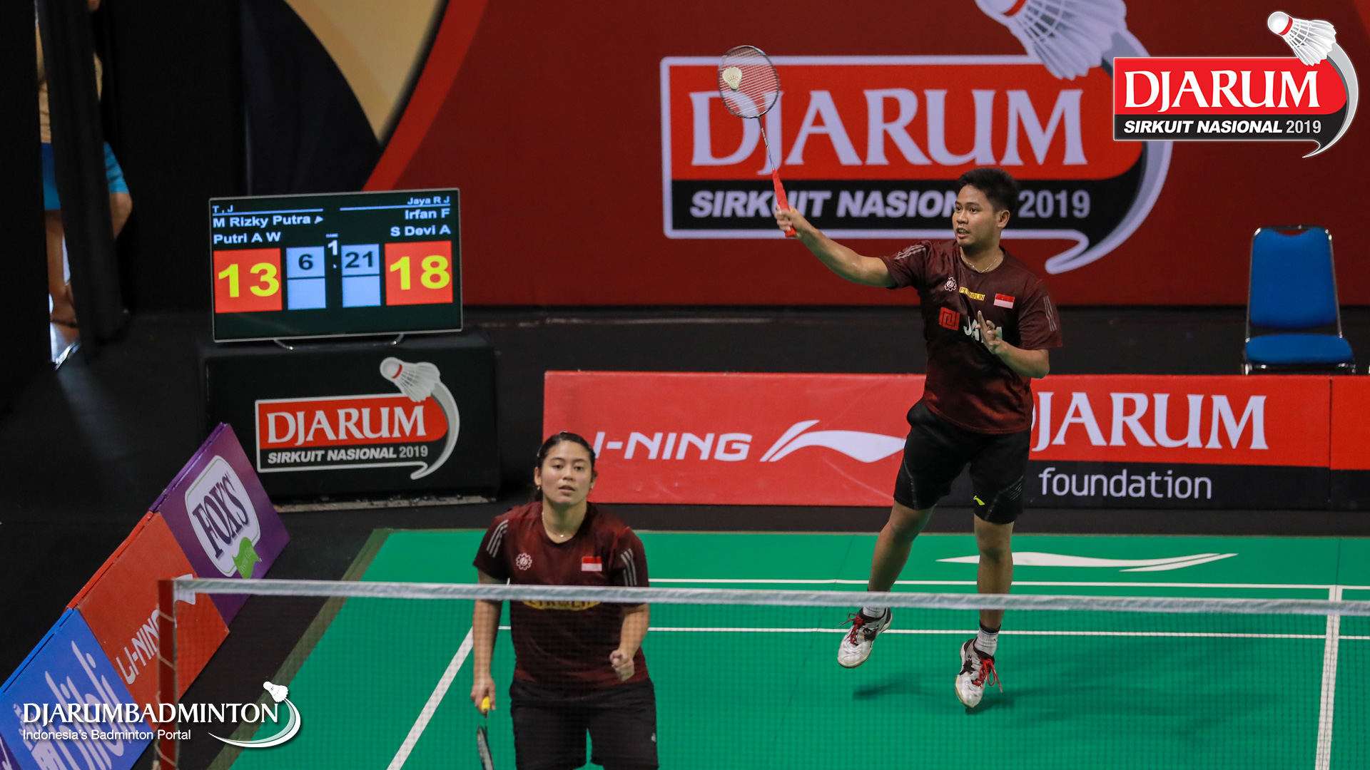 Irfan Fadhillah+Shela Devi Aulia (Jaya Raya Jakarta) mengembalikan shuttlecock
