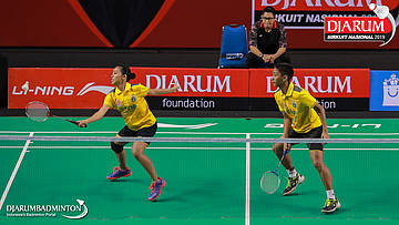 Mochamad Rafi Rizqi Kurniawan+Salli Lin (PB Djarum, Kudus) bersiap menyambut shuttlecock