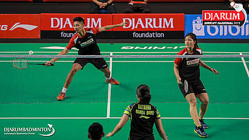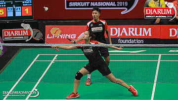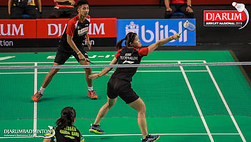 Dejan Ferdinansyah+Serena Kani (PB Djarum, Kudus) mengembalikan shuttlecock