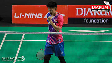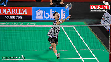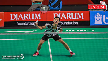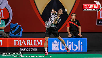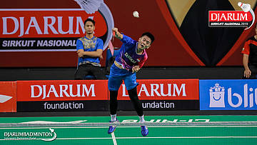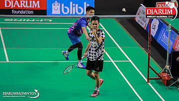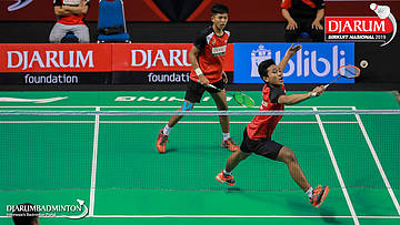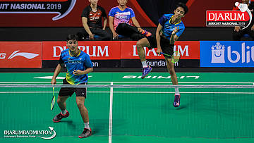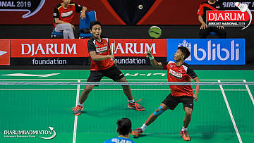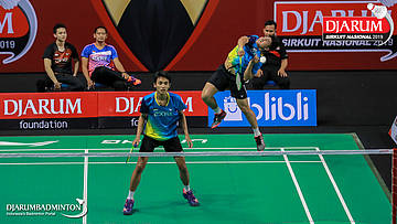 Ghana Muhammad Al Ilham+Mochamad Rafi Rizqi Kurniawan (PB Djarum, Kudus) bersiap menyambar serangan