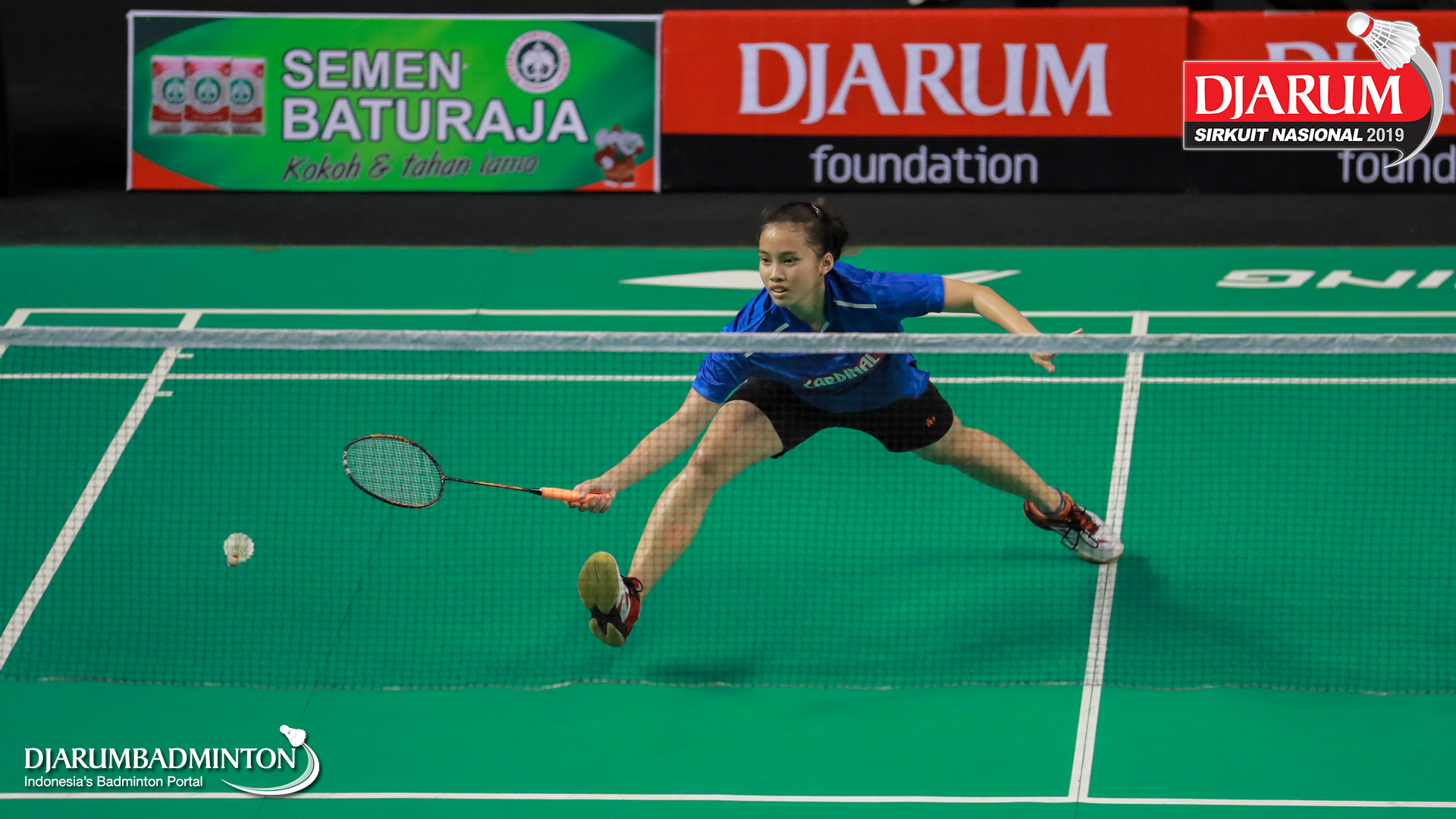 Siti Sarah Azzahra (Exist Badminton Club) berusaha menggapai pengembalian