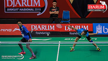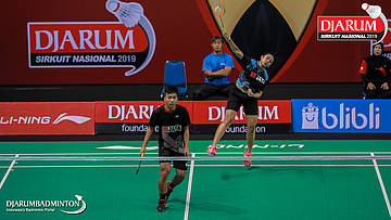 I Putu Pande Sheva Brahmantya Putra+Sintia Dewi Yuliani (PB Djarum, Kudus) mengembalikan shuttlecock