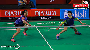 I Putu Pande Sheva Brahmantya Putra+Sintia Dewi Yuliani (PB Djarum, Kudus) berusaha mengembalikan serangan