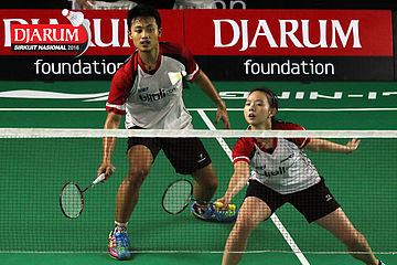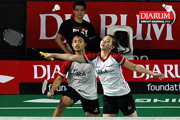 Akbar Bintang/Della Augustia (Djarum Kudus) mengembalikan shuttlecock.