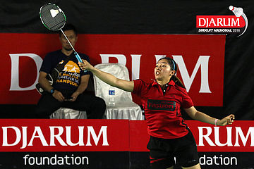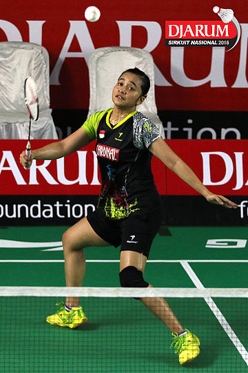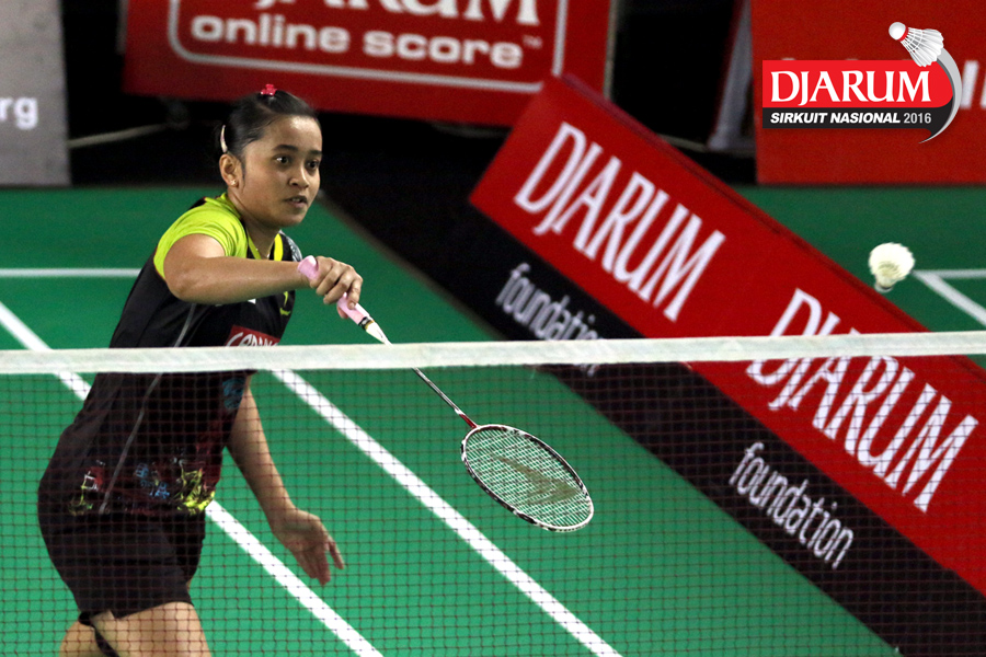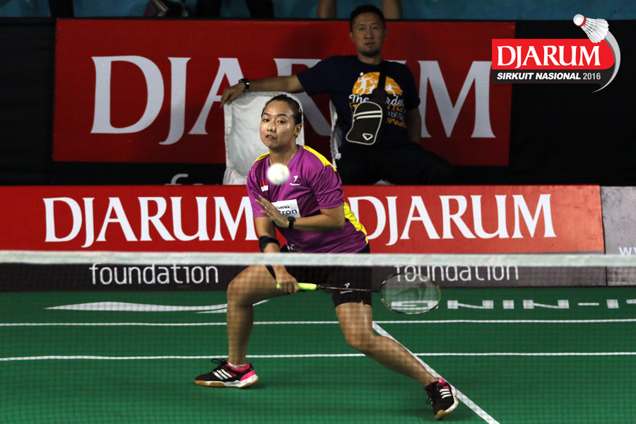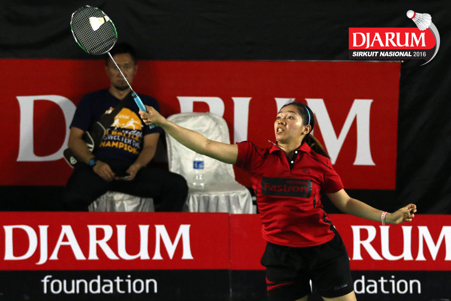 Febby Angguni (Pertamina Fastron) melepaskan serangan.