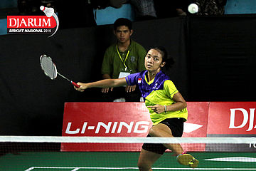 Febby Angguni (Pertamina Fastron) mengembalikan shuttlecock.