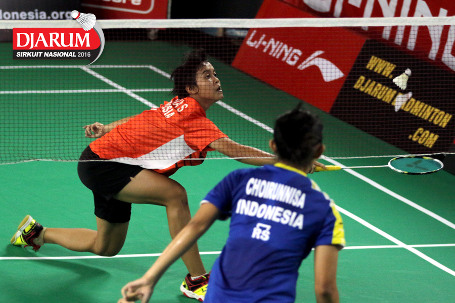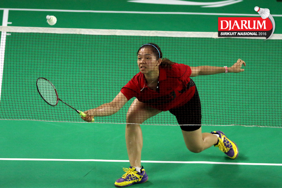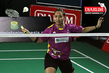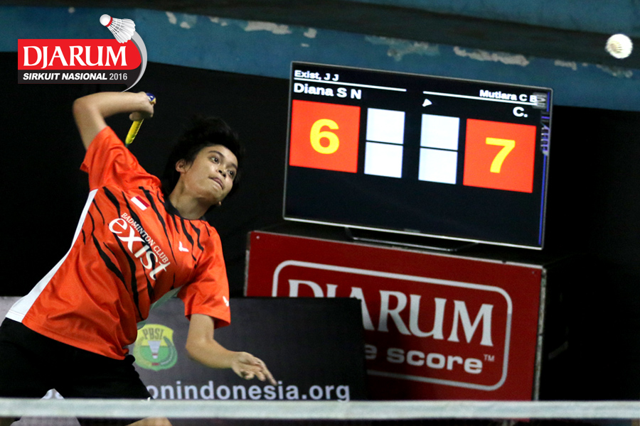 Diana Setiyo (Exist) mengembalikan shuttlecock.