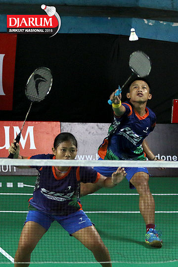 Aditya Muchlis/Annisa Mubarokah (FIFA) mengembalikan shuttlecock.