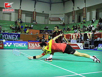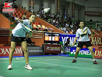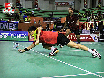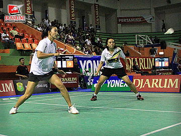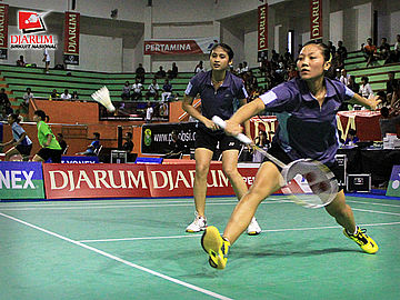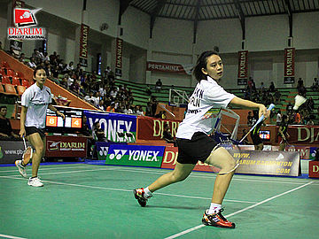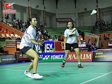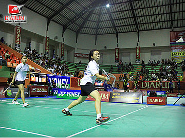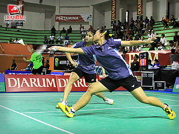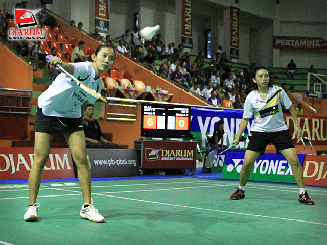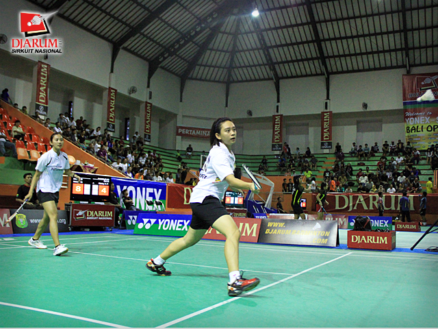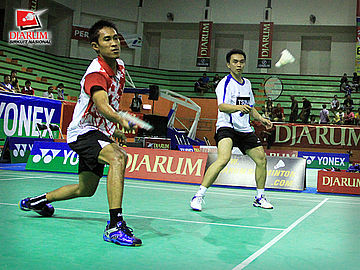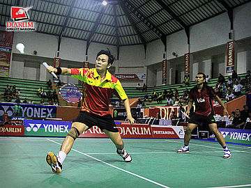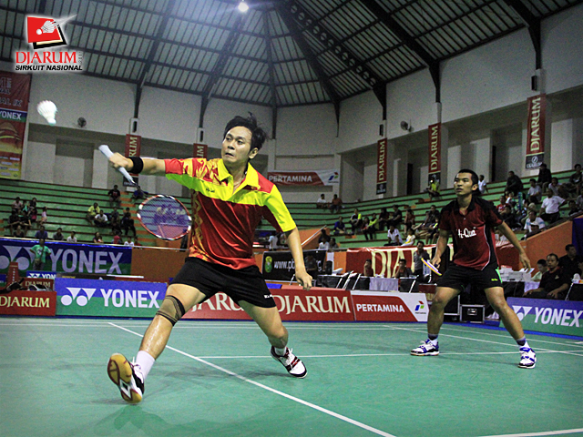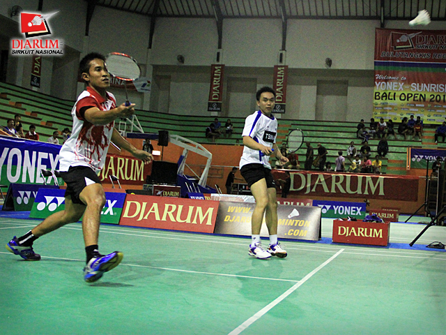 Pasangan ganda dewasa putra PB. HIQUA Wima Surabaya, I Komang Sandi/Moch. Andrean berusaha mengembalikan kok ke arah pasangan Dwi Setiawan / Hadi Saputra dalam babak final ganda dewasa putra Djarum Sirkuit Nasional Bali di GOR Purna Krida, Badung,Sabtu