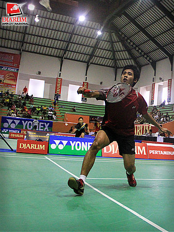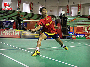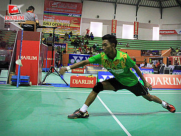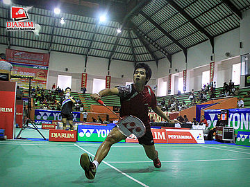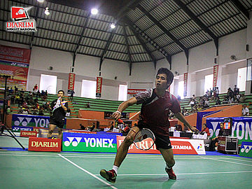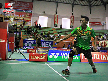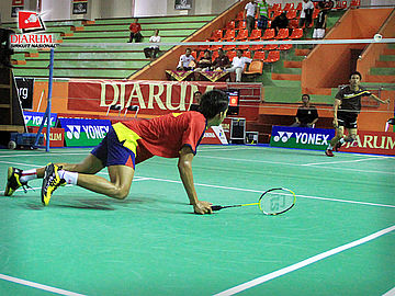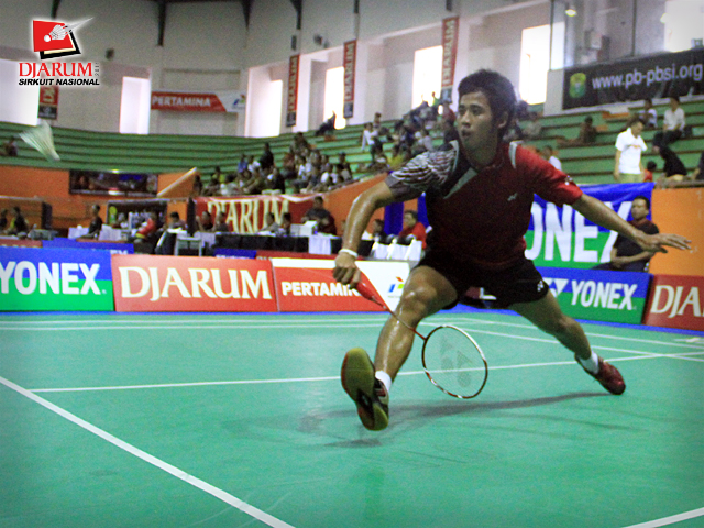Pemain PB Jaya Raya Surya Naga, Fauzi Adnan terjatuh saat berusaha mengembalikan kok ke arah pemain SGS PLN Bandung, Yohannes Hendri Apriliyanto dalam babak perempat final tunggal dewasa putra Djarum Sirkuit Nasional Bali di GOR Purna Krida, Badung.