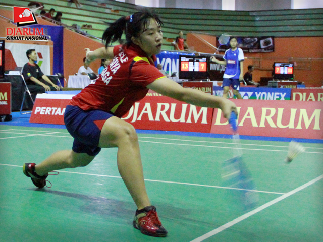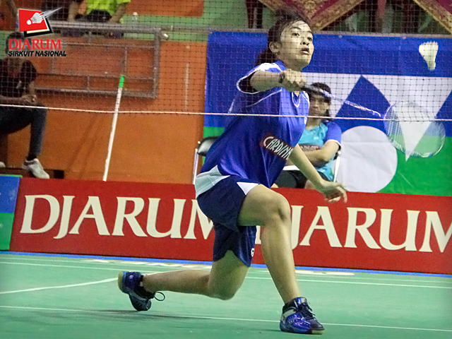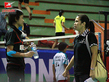 Pemain Djarum Kudus, Aida AA (kiri) tengah mendapatkan instruksi dari pelatihnya, Maria Elfira Christina kala berhadapan dengan pemain Jaya Raya, Shinta JN babak kualifikasi tunggal remaja putri Djarum Sirkuit Nasional Bali di GOR Purna Krida, Badung