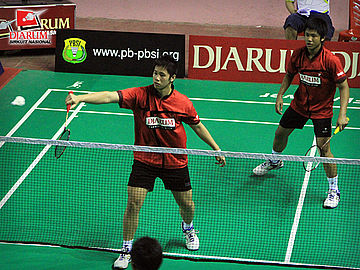 Pemain PB Djarum, Hantoro/Yantoni Edy S berusaha mengembalikan kok ke arah pemain PB Bayu Kencana Pasuruan, Dicky Eko B/M.Taqhjul Arifin B. dalam babak penyisihan ganda remaja putra Djarum Sirkuit Nasional Makassar di GOR Sungguminasa, Gowa, Rabu (19/1