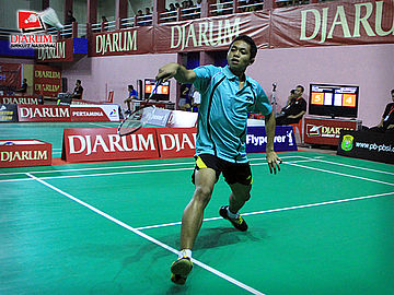 Pemain PB. Fila Watch Makassar, Chairil Anwar berusaha mengembalikan kok ke arah pemain Pusdiklat Jaya Raya, Imam Adi Kusuma dalam babak penyisihan tunggal remaja putra Djarum Sirkuit Nasional Makassar di GOR Sungguminasa , Gowa, Senin (17/10).