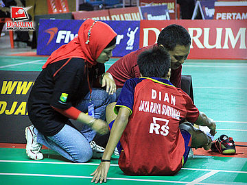 Pemain PB. Jaya Raya Suryanaga, Dian Hadi S mengalami cidera saat berhadapan dengan Platprov PBSI DKI Jakarta, Muhammad Nizar dalam babak penyisihan tunggal remaja putra Djarum Sirkuit Nasional Makassar di GOR Sungguminasa, Gowa, Senin (17/10).