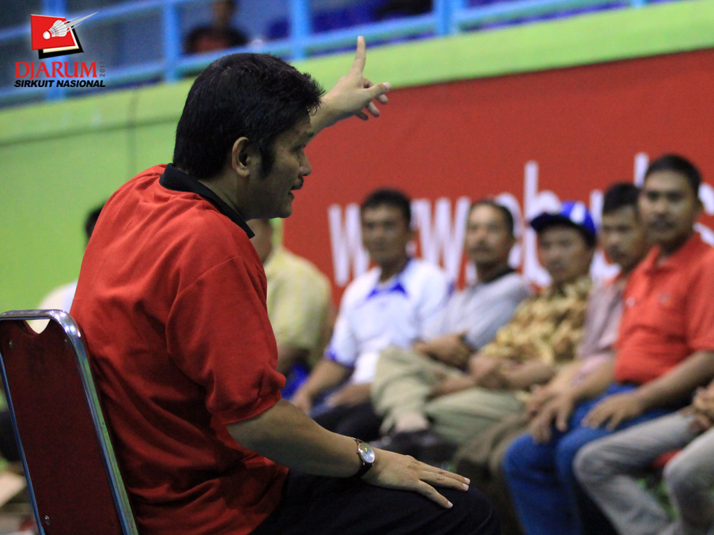 Koordinator Wasit, Hadi, tengah memberikan pengarahan kepada wasit yang akan memimpin laga dalam perhelatan Djarum Sirkuit Nasional (Sirnas) Pangkalpinang, 20-24 September