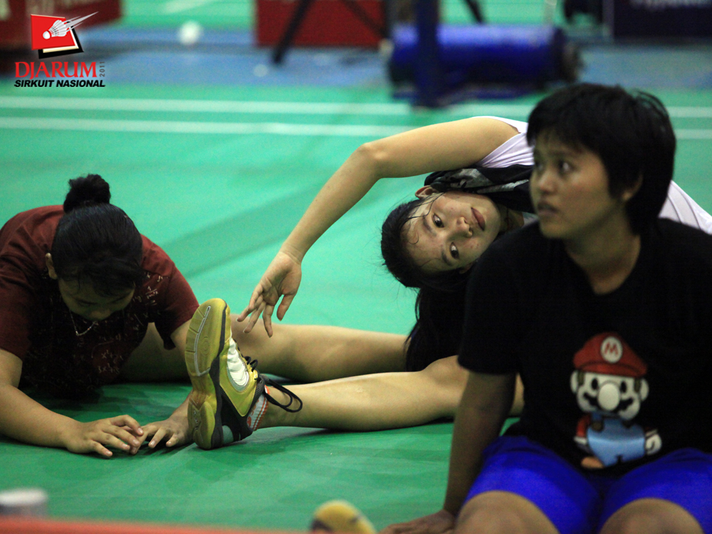 Beberapa pemain tengah melakukan pemanasan di sesi latihan Djarum Sirkuit Nasional (Sirnas) Pangkalpinang, Senin (19/9). Sirnas Pangkalpinang akan berlangsung mulai 20-24 September
