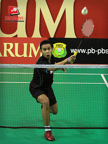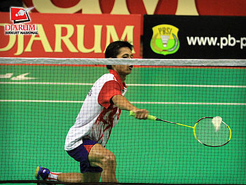 Pemain SGS PLN Bandung, Senatria Agus Setia Putra mengembalikan kok ke arah pemain Jaya Raya Suryanaga, Fauzi Adnan dalam babak Semifinal dewasa putra Djarum Sirkuit Nasional Surabaya di GOR Sudirman, SBY, Jum`at (4/11).