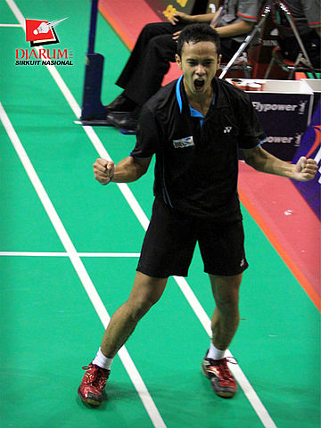 Pekikan kemenangan Pemain SGS PLN Bandung, Senatria Agus Setia Putra dalam babak Semifinal dewasa putra Djarum Sirkuit Nasional Surabaya di GOR Sudirman, SBY, Jum`at (4/11).