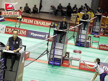 Empat wasit Kejuaraan Djarum Sirkuit Nasional (Sirnas) Bali 2012 yang sedang bertugas terlihat seius memimpin jalannya pertandingan.