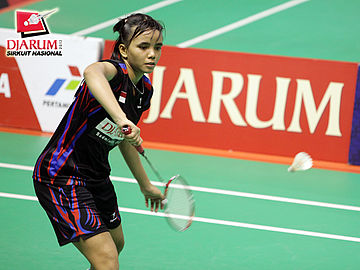 Arinda Sari Sinaga (PB Djarum Kudus) berusaha mengembalikan bola kearah Afni Fadillah (Ragunan).