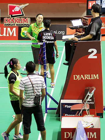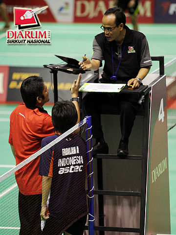 Salah satu official wasit tengah berdiskusi dengan wasit pertandingan setelah pebulutangkis tunggal putri asal Ragunan, Afni Fadillah melakukan protes.