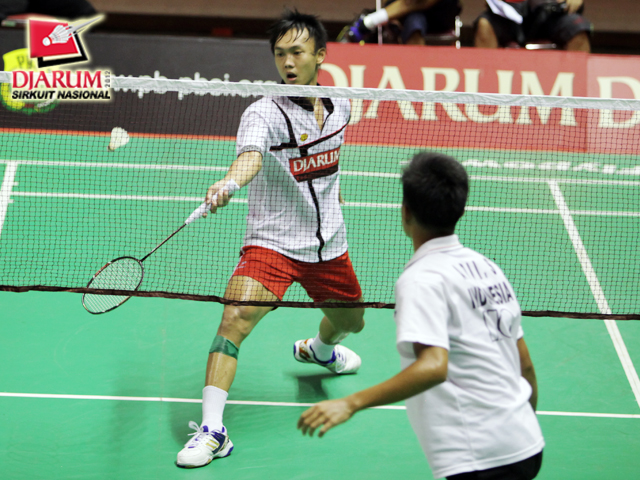 Kukuh Adji dari (Hiqua Wima) kiri, berusaha mengembalikan bola ke arah Rudi Cahyadi asal PB Djarum Kudus (kanan).