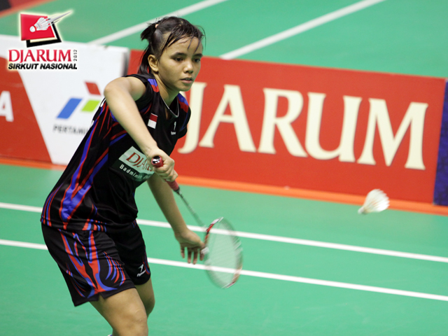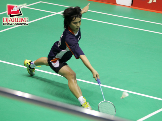 Afni Fadillah (Ragunan) berusaha mengembalikan bola kearah Arinda Sari Sinaga (PB Djarum Kudus).