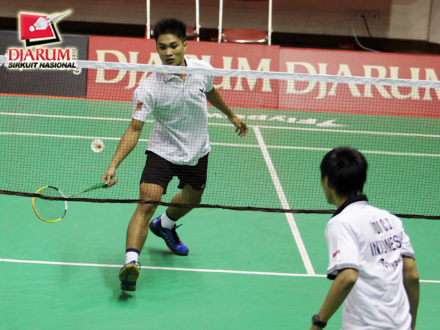 Pebulutangkis tunggal putra PB Djarum Kudus, Bayu Pangisthu menyambut serve dari unggulan pertama, Rifan Fauzin (Pelatprov PBSI DKI Jakarta).