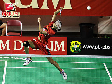 Unggulan pertama tunggal putra dewasa, Alamsyah Yunus (Pertamina Indonesia) melepaskan smash keras ke arah Andreas Adityawarman (PB Djarum Kudus).