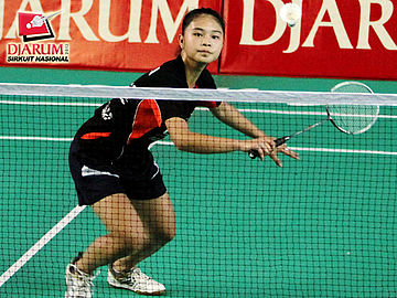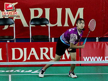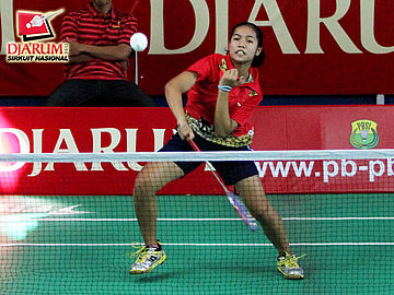 Dianita (Guna Dharna) sedang mengembalikan kok kepada lawannya, Mychelle C (Djarum Kudus), pada babak qualifikasi