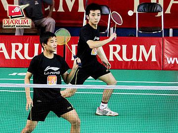 Pasangan ganda remaja putra dalam babak qualifikasi, Dioda Kanza/ Rifky (Pusdiklat Jaya Raya) yang sedang berhadapan dengan pasangan Henwinner/ Reno Prabowo (Guna Dharma).