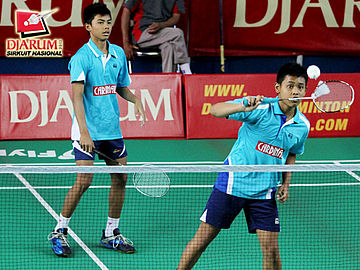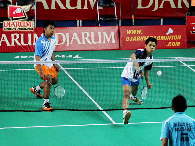 Sakti yang berpasangan dengan Yuda dari PB. SGS PLN sedang mengembalikan kok kepada lawannya, Aji Firmansyah/ M Zico (Mutiara Bandung).