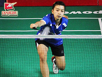 Abraham Yoga (Mutiara Bandung) sedang mengembalikan kok kepada Senatria Agus Setia Putra (SGS PLN).