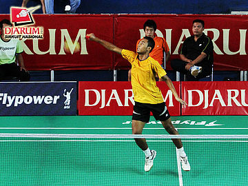 Bandar Sigit Pamungkas (Djarum Kudus) sedang melakukan jump smash pada saat berlaga melawan Ronal Fazrin (Pelabuhan II).