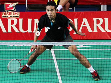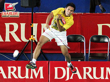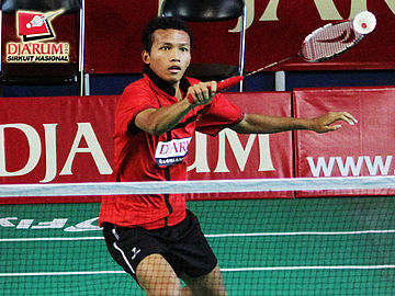 Fauzi Adnan (Jaya Raya Suryanaga) sedang mengembalikan kok kepada lawannya Indra Setiawan (Pertamina Indonesia).